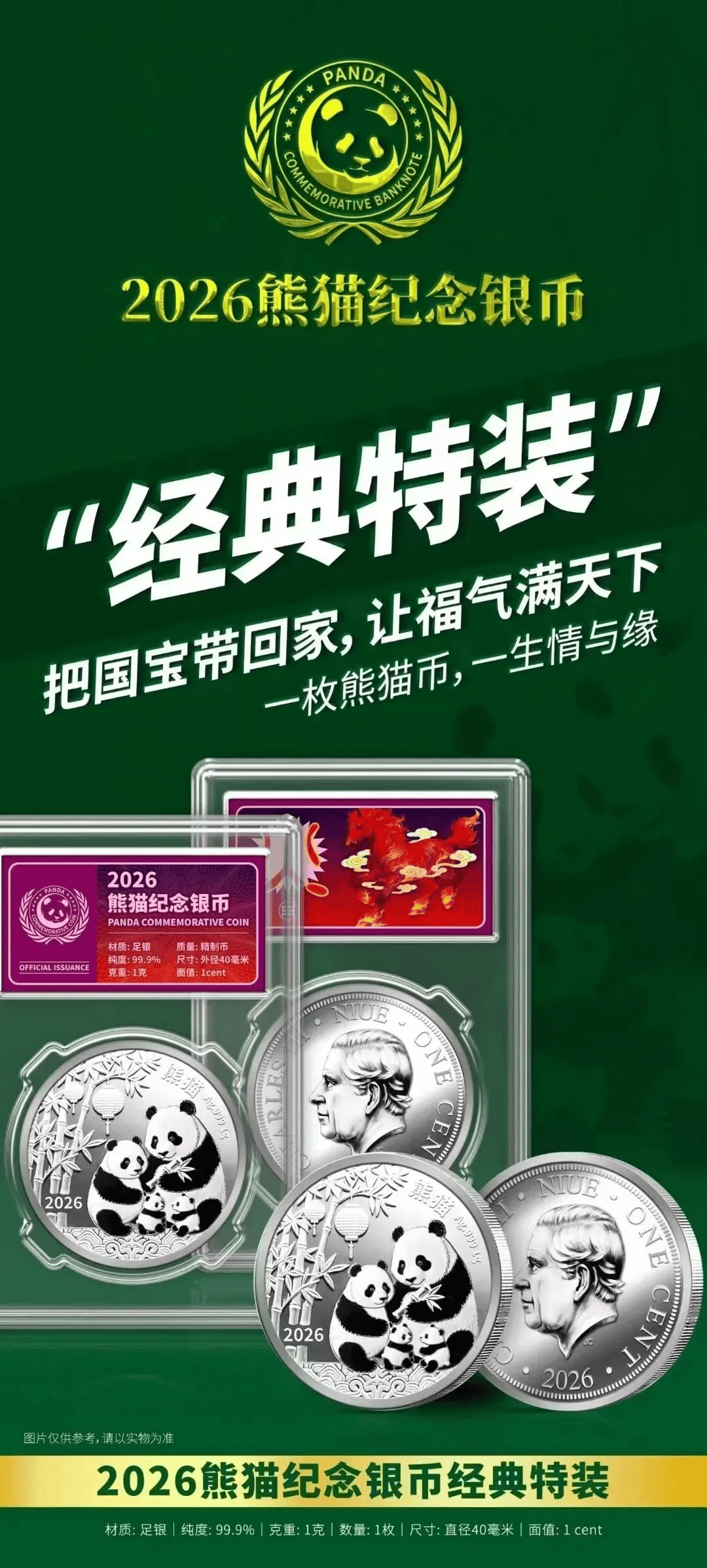 含Ag999足银1克,打造集“国宝名片、法定货币、贵金属材质”于一体的国际版熊猫纪念币。