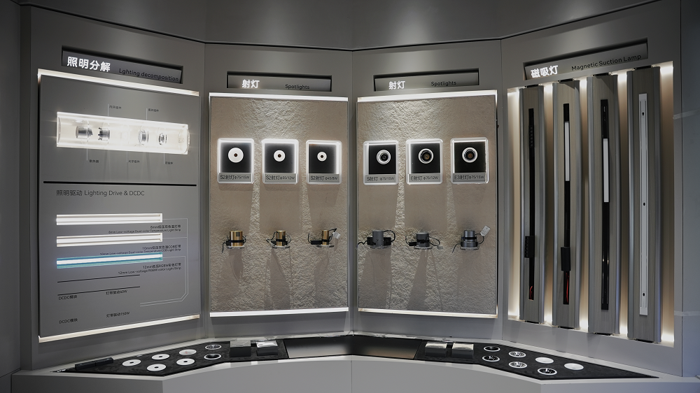 交互体验上,入口区域设置触摸联动装置,用户轻触灯泡即可触发全屋光效联动,灯光从单色温逐步切换为多维智能光效,客厅区域同步呈现层次丰富的空间光感变化,让消费者在进店之初便直观感受智能照明的核心魅力,实现品牌理念与产品体验的瞬间共鸣。