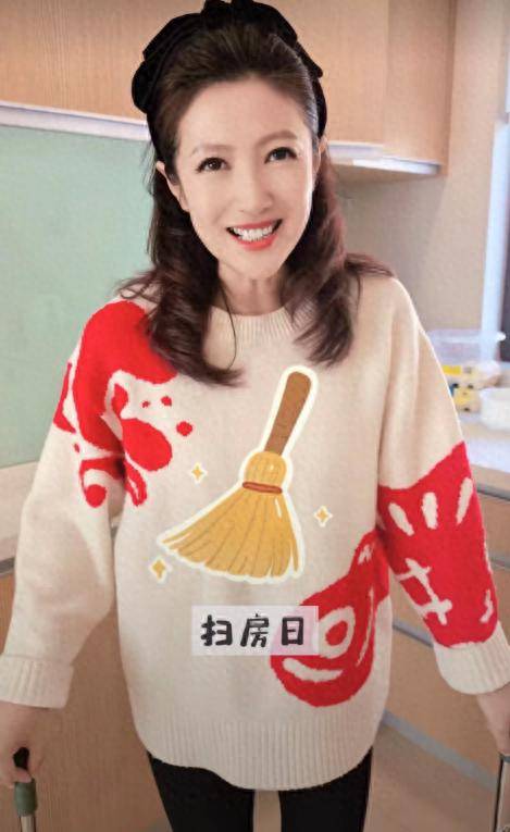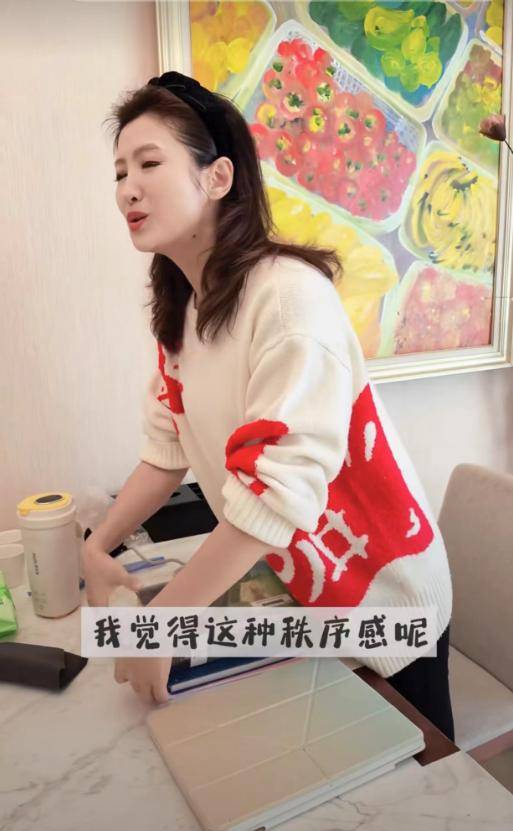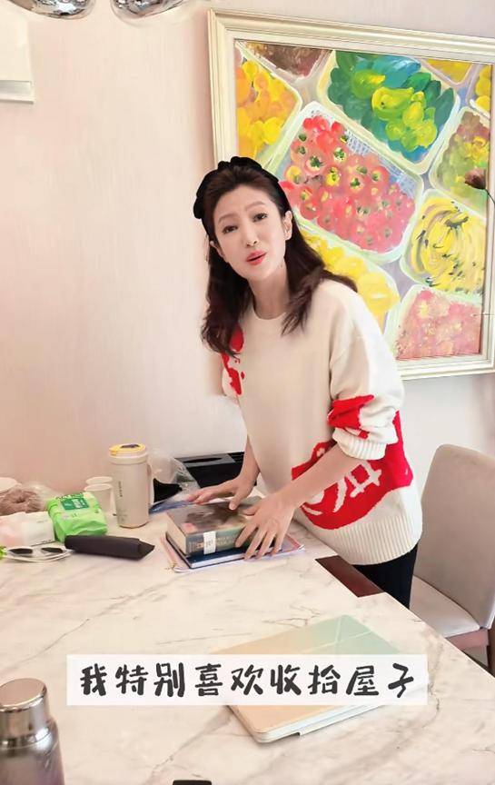 今年48岁的春妮穿着米白色毛衣配黑裤子,镜头前的她没有一点央视主持人的距离感,一边打扫一边跟网友唠家常,随口一句“房间是灵魂的外放”,尽显主持人的文采。