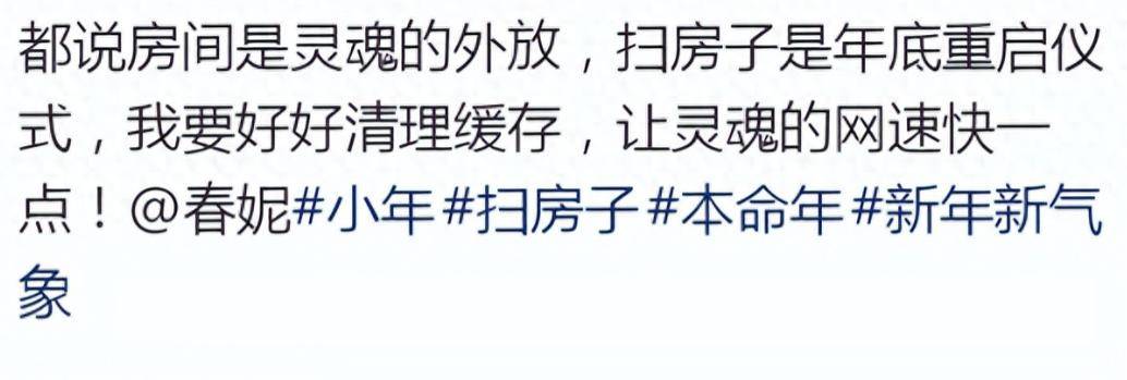 有意思的是,春妮打扫的时候还特别讲究,全程都在跟网友分享小年扫尘的俗,说什么上午11点到下午3点是扫房子的最佳时间,这就是老辈人说的“七扫金八扫银”,还得遵循从上往下扫、从里到外扫,不能回头也不能带怨气的原则,每一个讲究里,都是对新年的美好寓意。
