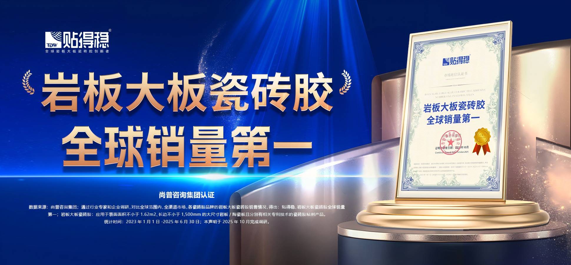 全球岩板大板瓷砖胶赛道迎来历史性时刻——经国际权威市场研究机构尚普咨询集团严格审计认证,正式摘得“岩板大板瓷砖胶全球销量第一”“全球开创者”“全球领导者”三项重量级桂冠,成为该细分领域首个斩获全球销量冠军的中国品牌。这一认证不仅刷新了中国建材辅材品牌在国际市场的竞争位次,更标志着以贴得稳为代表的本土瓷砖胶企业已从技术追随者蜕变为全球规则制定者。