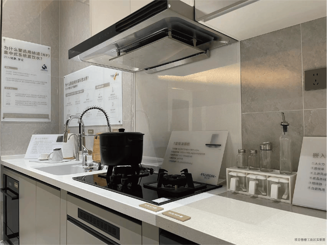厨房堪称亮点,人造石无缝拼接大单槽美观又好打理,抽拉式水龙头清洗无死角,油烟机、灶具等选用日本富士帝品牌,部分户型还配备了洗碗机和蒸烤一体机。